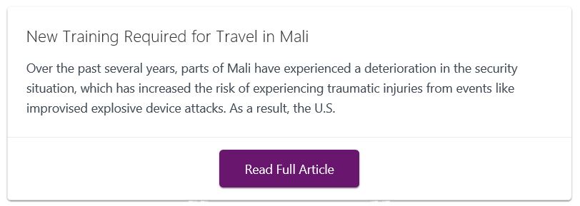 One of my first tasks as a Fellow was to draft an article for Inside NIAID, an internal informational resource for NIAID employees. This involved writing about the new safety training requirement, (Massive hemorrhage, Airway control, Respiratory support, Circulation, and Hypothermia (MARCH)), that the U.S. Embassy in Bamako, Mali, established for all federal employees traveling outside of the Bamako Capital District. The article addressed the nature of the training, its necessity, relevant exceptions, and information around how to obtain the training.