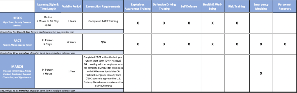 I was tasked with creating a comparison chart for the various trainings that federal employees can take prior to international travel. This is a resource that those in the Office of Global Research (OGR) can refer to when coordinating international travel for NIAID employees. The chart includes three trainings that federal employees can partake in, which include High Threat Security Overseas Seminar (HTSOS), Foreign Affairs Counter Threat (FACT), and Massive hemorrhage, Airway control, Respiratory support, Circulation, and Hypothermia (MARCH). The chart includes information around teaching style and length of training, validity period, exemption requirements, and training content.